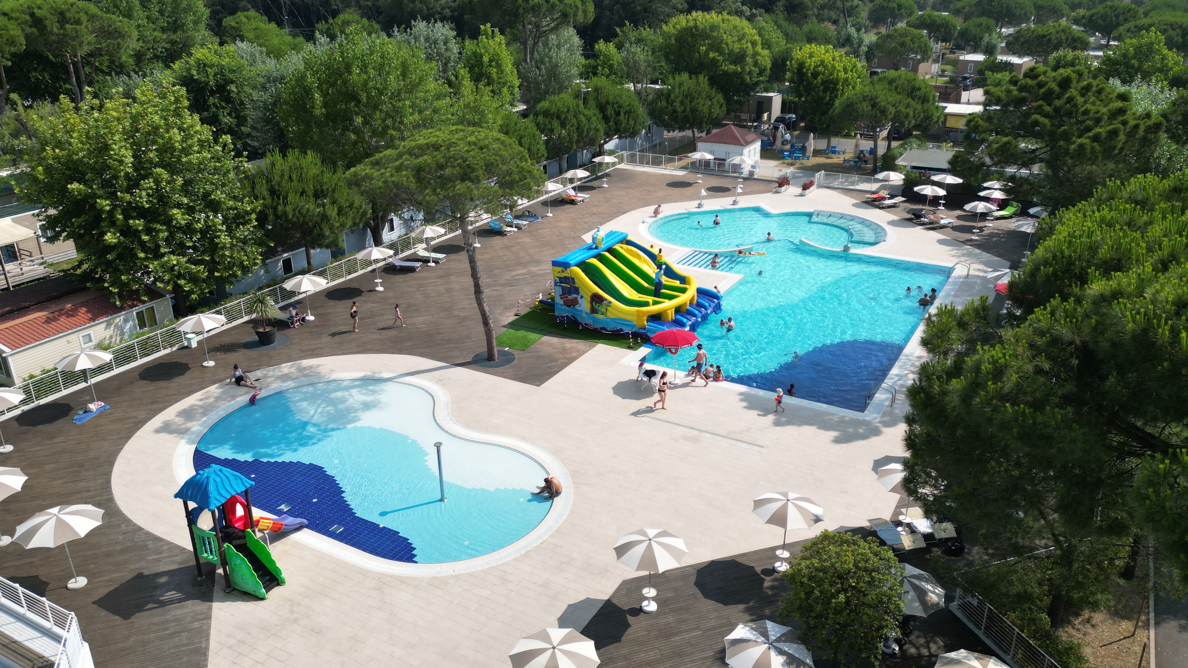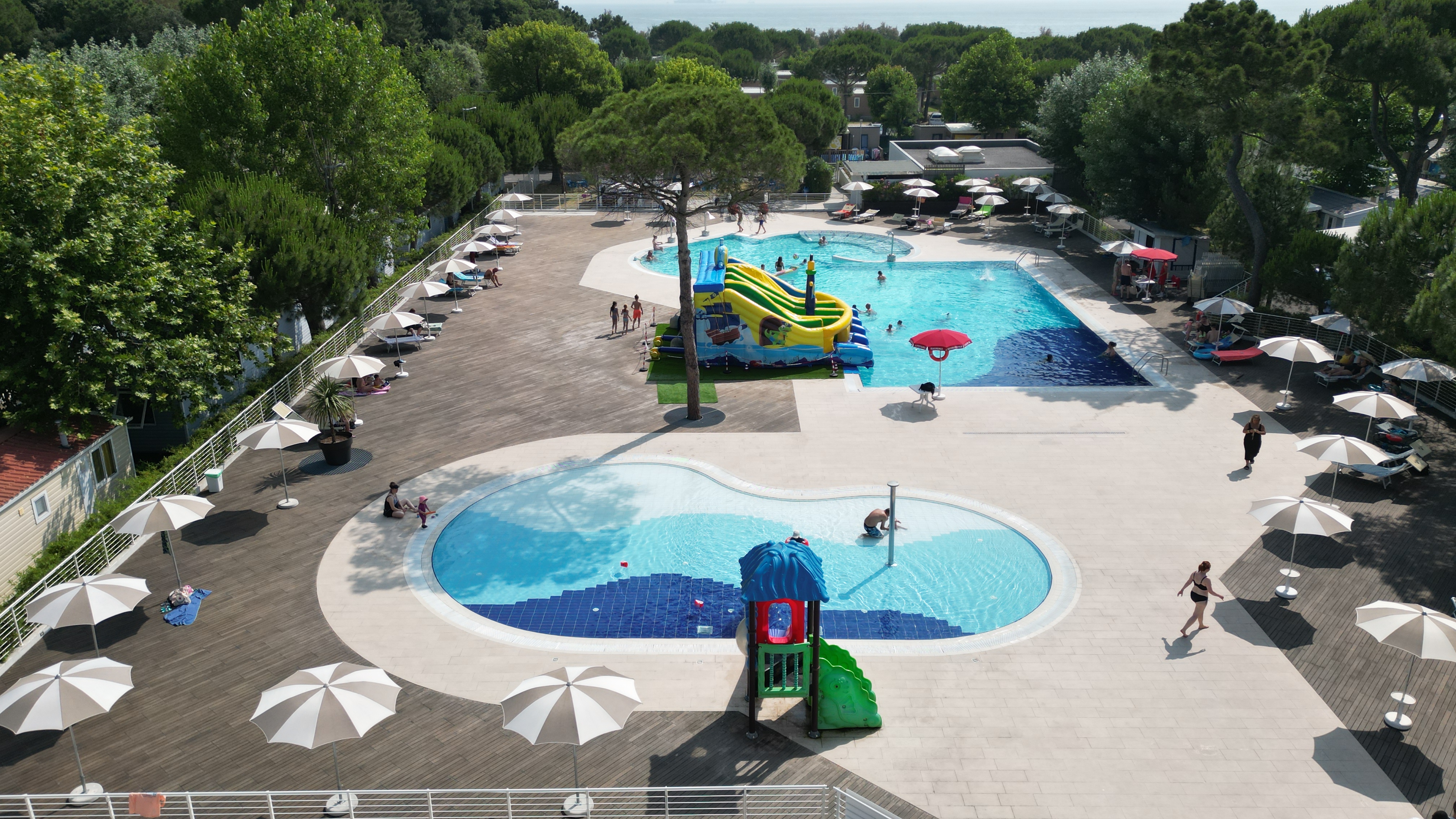 BASENYNa terenie campingu możemy znaleźć dwa baseny, jeden tradycyjny a drugi przeznaczony do relaksu, dzięki wyposażeniu w hydromasaż, dysze szyjne oraz jacuzzi. Baseny otwarte są od 16.05 do 13.09 codziennie od 10:00 do 19:00.